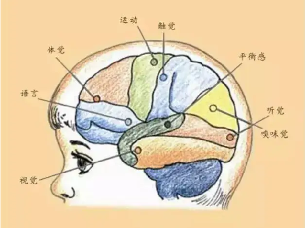 众所周知,大脑是由左右两个半球构成,半球的表面是大脑皮层(中枢功能区)。左半球抽象思维,右半球形象推理。再看下图,皮层的各个中枢区~六根对应六识《眼耳鼻舌身·意》。